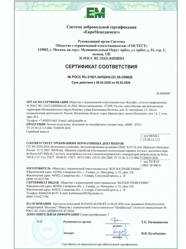 Сертификат на котлы MICRO New, котлы наружного размещения MICRO New NR 50-600 кВт ООО КОТЛОСТРОЙСЕРВИС